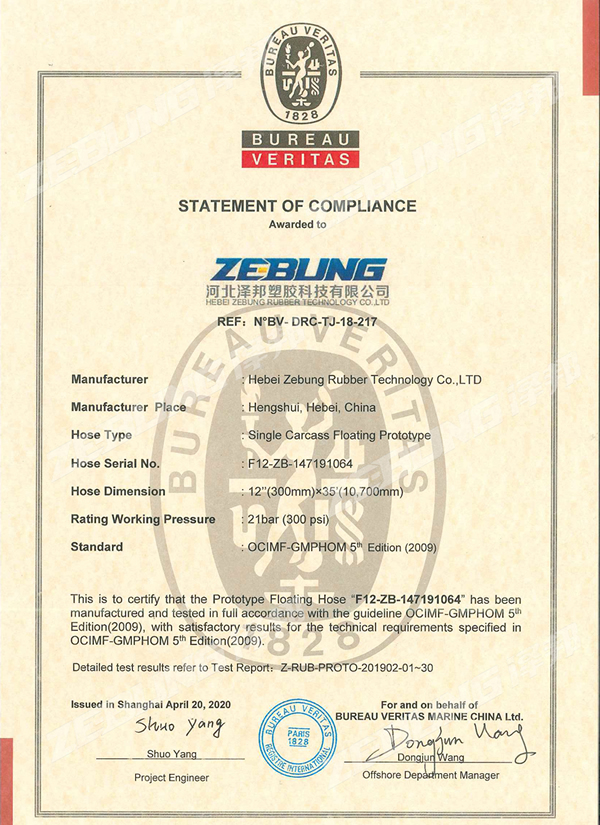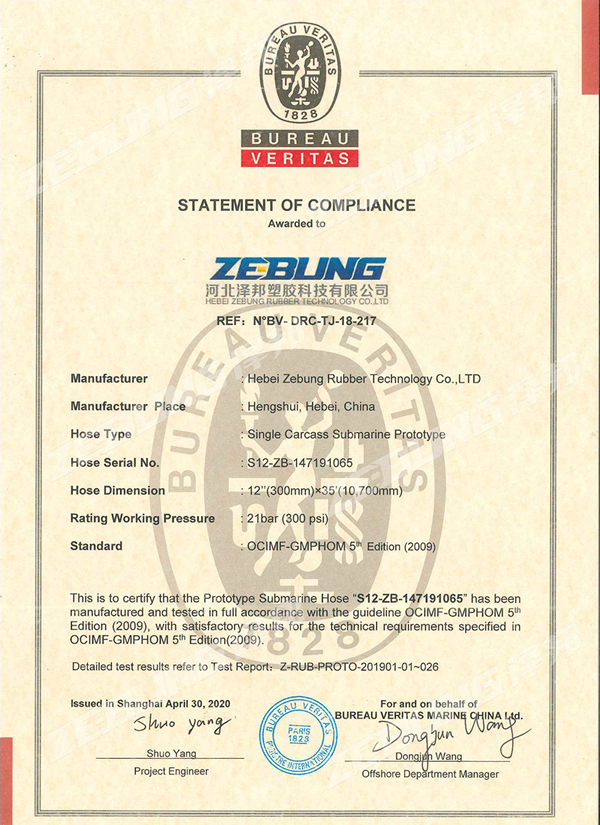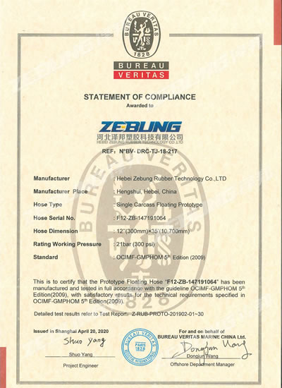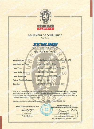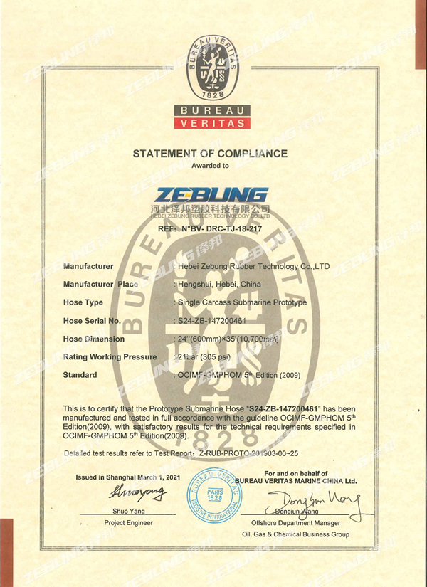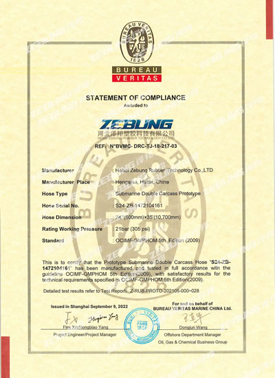Nossas mangueiras submarinas são projetadas e fabricadas de acordo com o padrão OCIMF e são certificadas pelo sistema de gerenciamento de qualidade ISO 9000:2001.